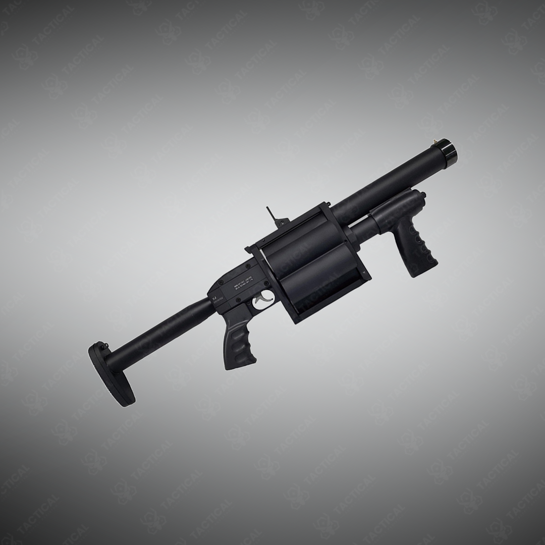 A durable six‑shot pump‑action launcher engineered for high‑intensity riot control and multi‑target engagements.