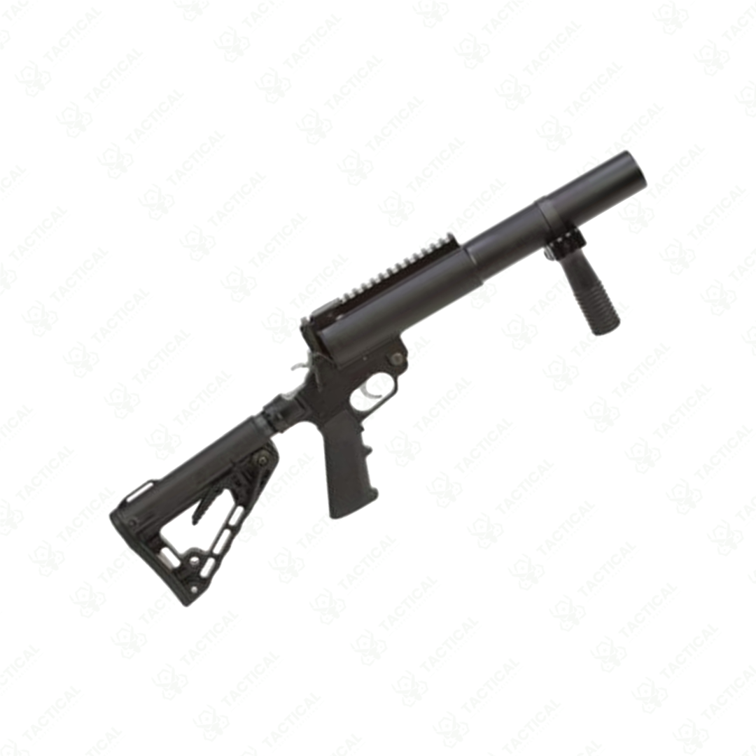 Tactical single-shot 40 mm launcher with expandable Rogers Super Stock, adjustable integrated front grip with light rail, and Picatinny top rail for sights and accessories.