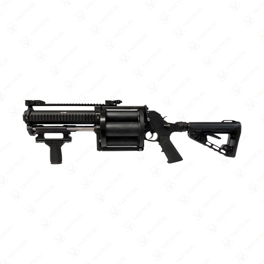 Compact four‑round tactical launcher built for riot and operational use, featuring pump‑action cylinder advance and upgraded durability components.