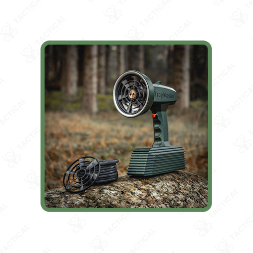 The TrapMaster Handheld Clay-Target Thrower launches clay pigeons through battery-powered mechanism eliminating manual cocking or spring tension adjustments. The device weighs 4.4 pounds with dimensions of 8.67×5.12×11.66 inches in moss green finish for low visibility during field use. A 5200 mAh lithium battery provides extended throwing sessions with fast charging reaching 70% capacity in 2.5 hours and full charge in 5 hours. Variable launch parameters allow operators to adjust target direction, speed, and trajectory angle for diverse shooting scenarios without mechanical reconfiguration.