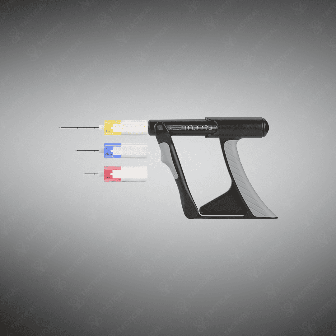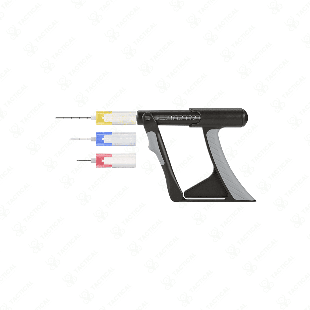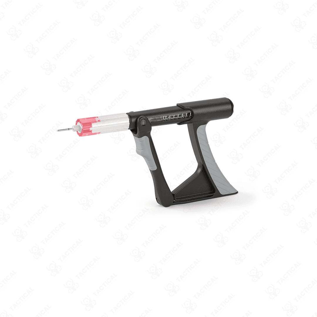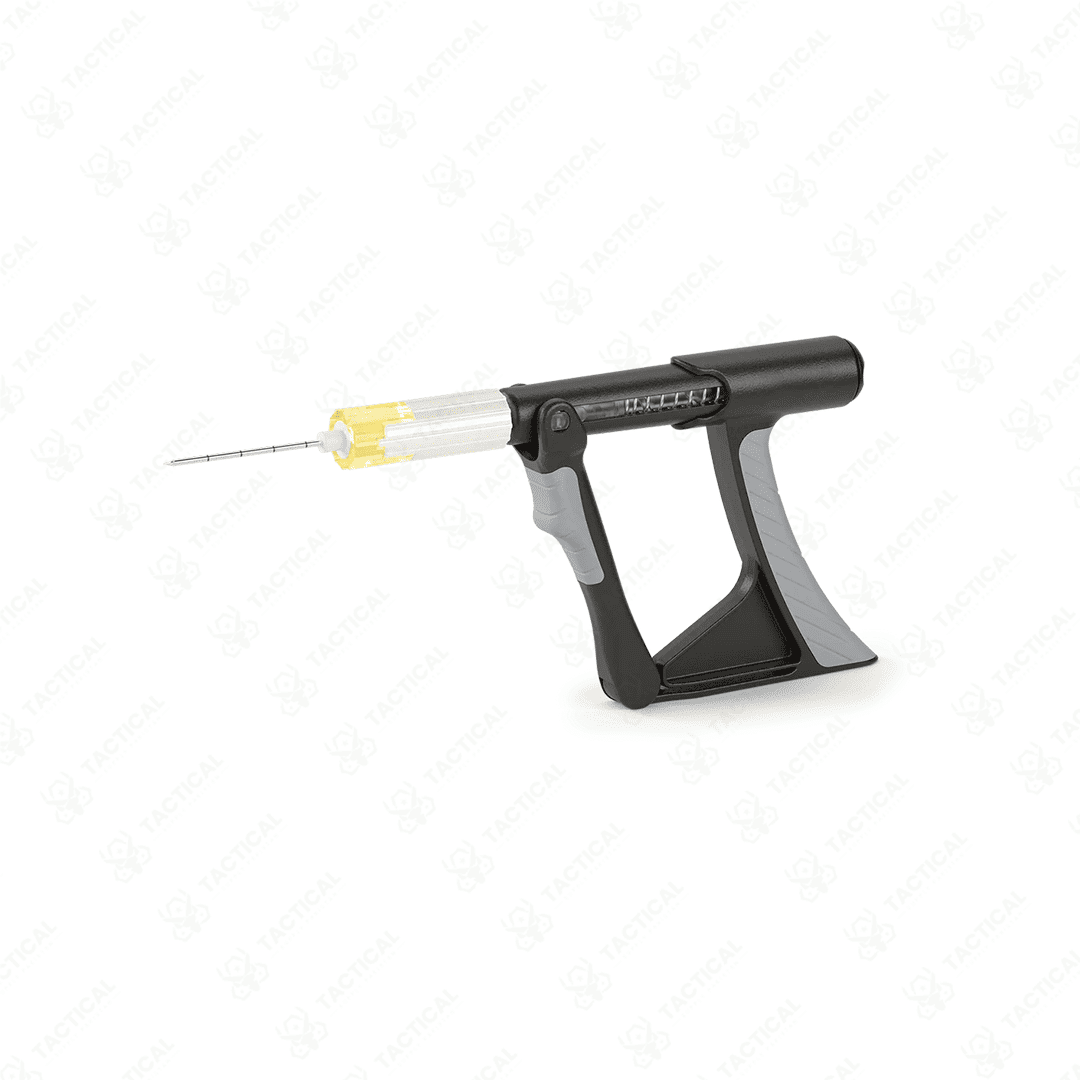 Built from rugged MIL-STD 810G-tested polycarbonate, the driver withstands extreme conditions and over 10,000 trigger actuations. The needle hubs use color coding to help identify patient size: pink for pediatric, blue for adult, and yellow for humeral access. Moreover, replacement needle packs and extension tubing attach firmly to the Luer-lock connector. All components fit into a compact field case, which is ideal for tactical medic kits.