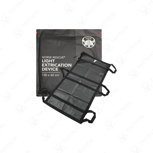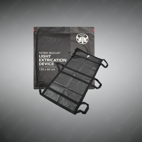 The Light Extrication Device measures 120 x 60 centimeters and weighs 500 grams, constructed from water-resistant coated woven polyethylene in black color. It features six large reinforced handholds positioned along its perimeter for multi-person carrying operations. The device supports loads exceeding 500 kilograms, verified through load-bearing tests that meet Class I medical device standards. Its dual-layer construction combines a protective backboard cover with an integrated patient transfer system that deploys without additional components.