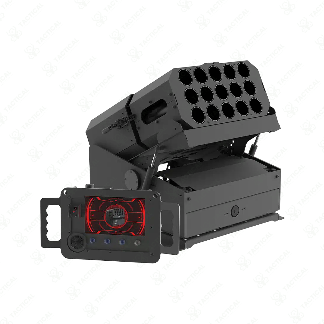 Multi‑tube vehicle/fixed‑mount smoke launcher for obscuration and crowd‑control; supports sequential or collective firing with integrated cameras and 7″ digital control.
