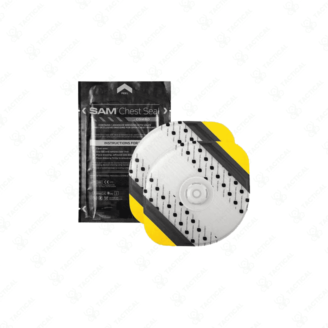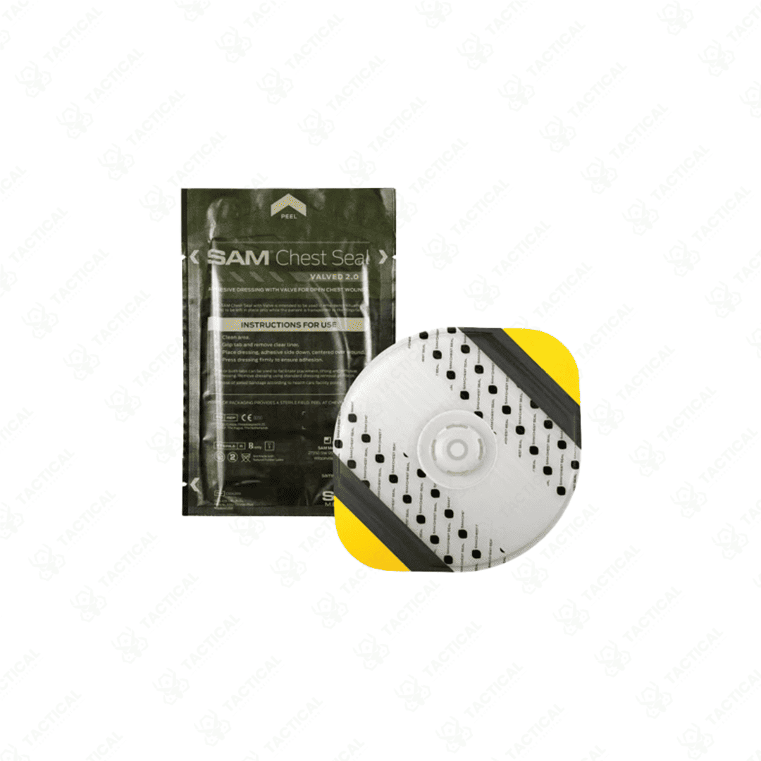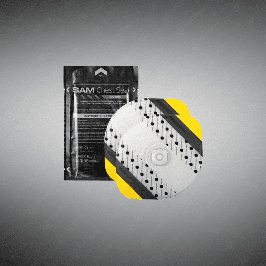 Sam Chest Seals deliver rapid, effective treatment for open chest wounds. Each seal uses a sterile hydrocolloid adhesive that forms a strong, airtight bond with the skin. The package includes two 4.5-inch by 4.5-inch seals, which makes dual application possible when necessary. A clear plastic backing helps users place the seal correctly and visually confirm the wound site. Moreover, the low-profile design limits bulk, allowing easier integration with clothing and gear. The adhesive maintains its grip, even in wet or harsh environments.