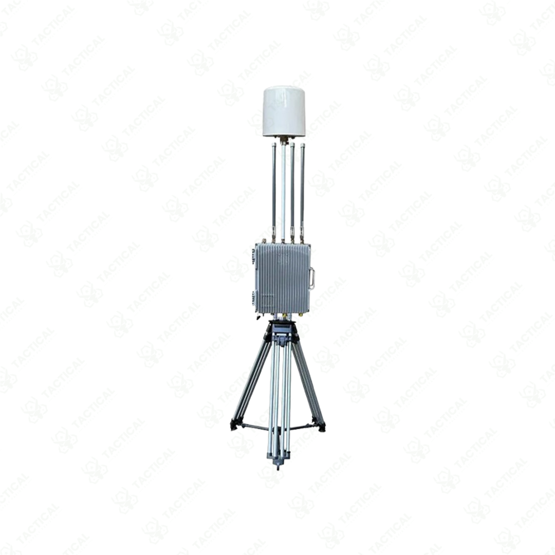 The Stationary Drone Detection and Direction Finding All-in-One System operates as a passive receiver covering 30 MHz to 6 GHz without emitting electromagnetic signals. The main device measures 370×335×189 mm and weighs 13 kg in a flight case. Eight dedicated receiving antenna connectors support GPS, Wi-Fi, 1.4 GHz, full-band, 433 MHz, 5 GHz, 2.4 GHz, and 4G frequencies. Detection sensitivity reaches -105 dBm with 360-degree full airspace coverage. The antenna package measures 400×310×310 mm, while the tripod assembly stands 1030 mm tall. Power operates on AC 110–240V at approximately 100W consumption.